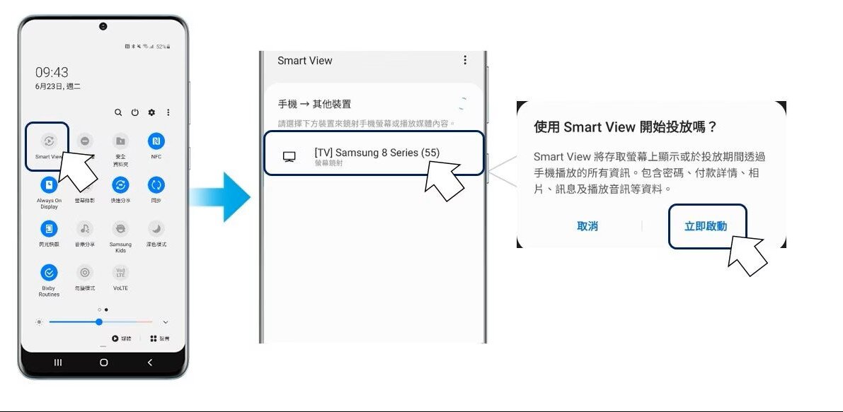 三星安卓设备:下拉控制中心 → 点击 Smart View → 连接三星电视